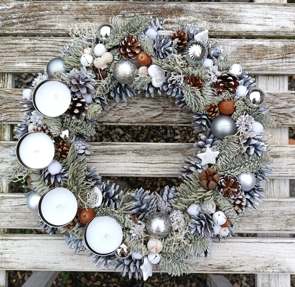 - bohatě zdobený věnec - šišky, neopadavé jehličí normandské jedle, již suché, ale neopadavé, přízdoby