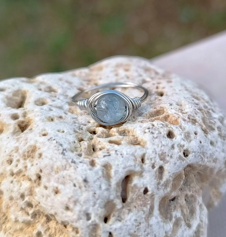 - prsten umotaný z nerezového drátku, uprostřed blankytně modrý, lehce průhledný akvamarín (korálek 6 mm velký)