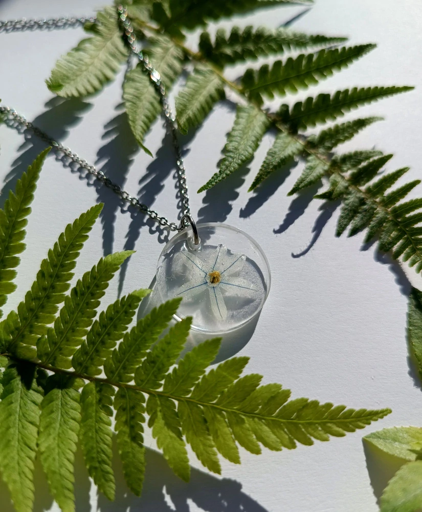 - něžný bílý květ s modrým žíháním (z lesa), zalitý v pryskyřici