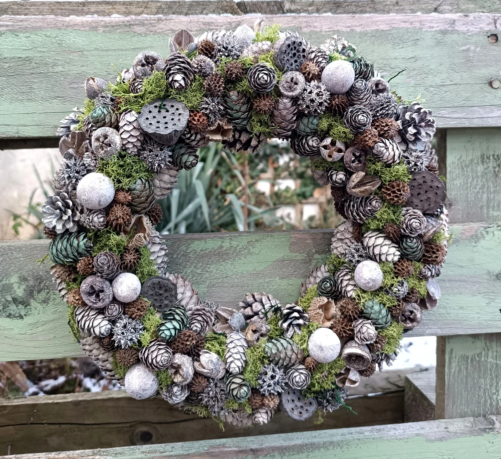 - bohatě zdobený věnec z přírodního materiálu - mix šišech a suchých plodý v ivory, bílé, hněné a zelenkavé barvě