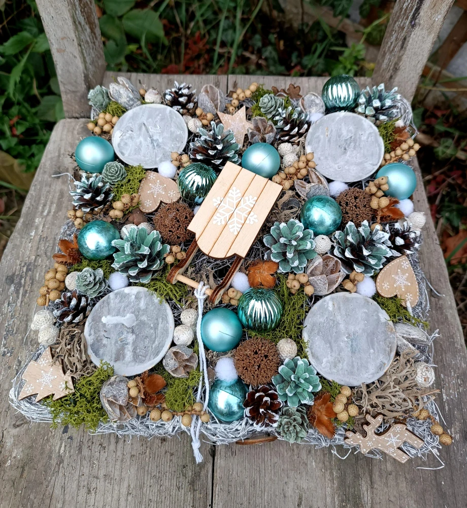 - bohatě zdobeno přírodninami a dřevěnými ozdobami - krásnými sáněmi, hvězdičkami, srdíčky, stromečky, sobíky