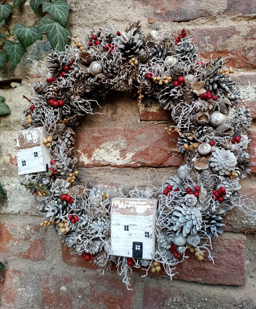 - velký, masivní věnec z přírodního materiálu - šišky, bukvice, žaludy drátovec, červená a hnědá canella..
