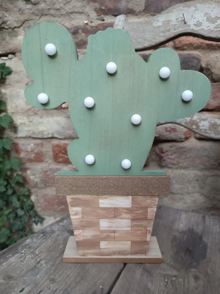 - dřevěný kaktus s led žárovkami, večer výrazně svítí, stačí vzadu zapnout (dvě tužkové baterie jsou v ceně)