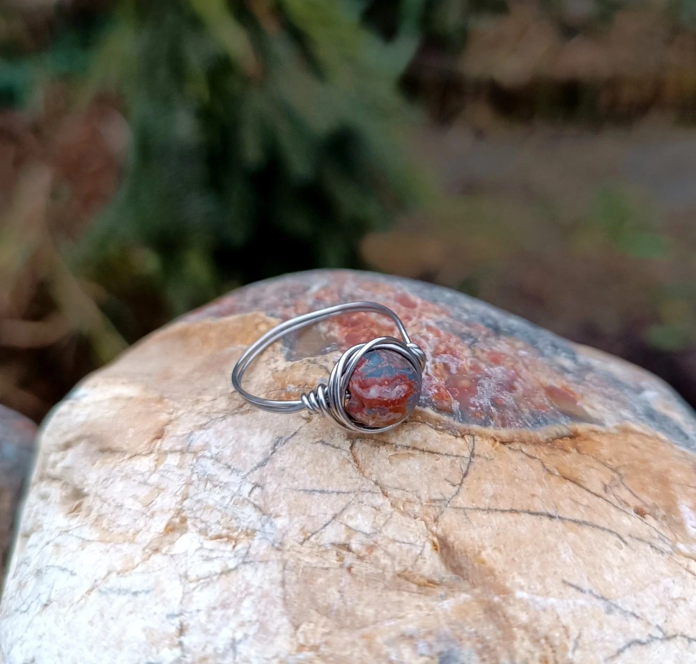 - prsten umotaný z nerezového drátku, uprostřed výrazný jaspis v matném provedení (korálek 8mm velký)