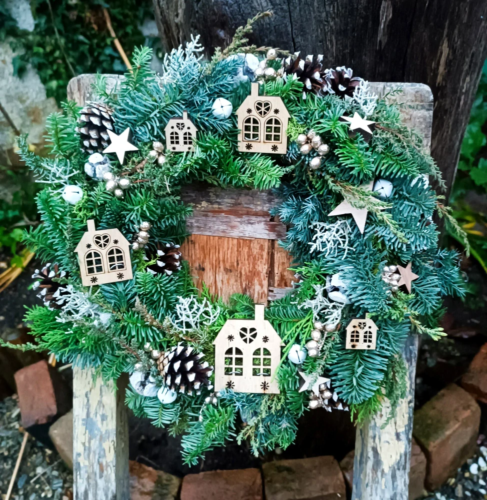- několik druhů jehličí upleteno do vánočního kabátku pro dřevěné domečky a hvězdičky
