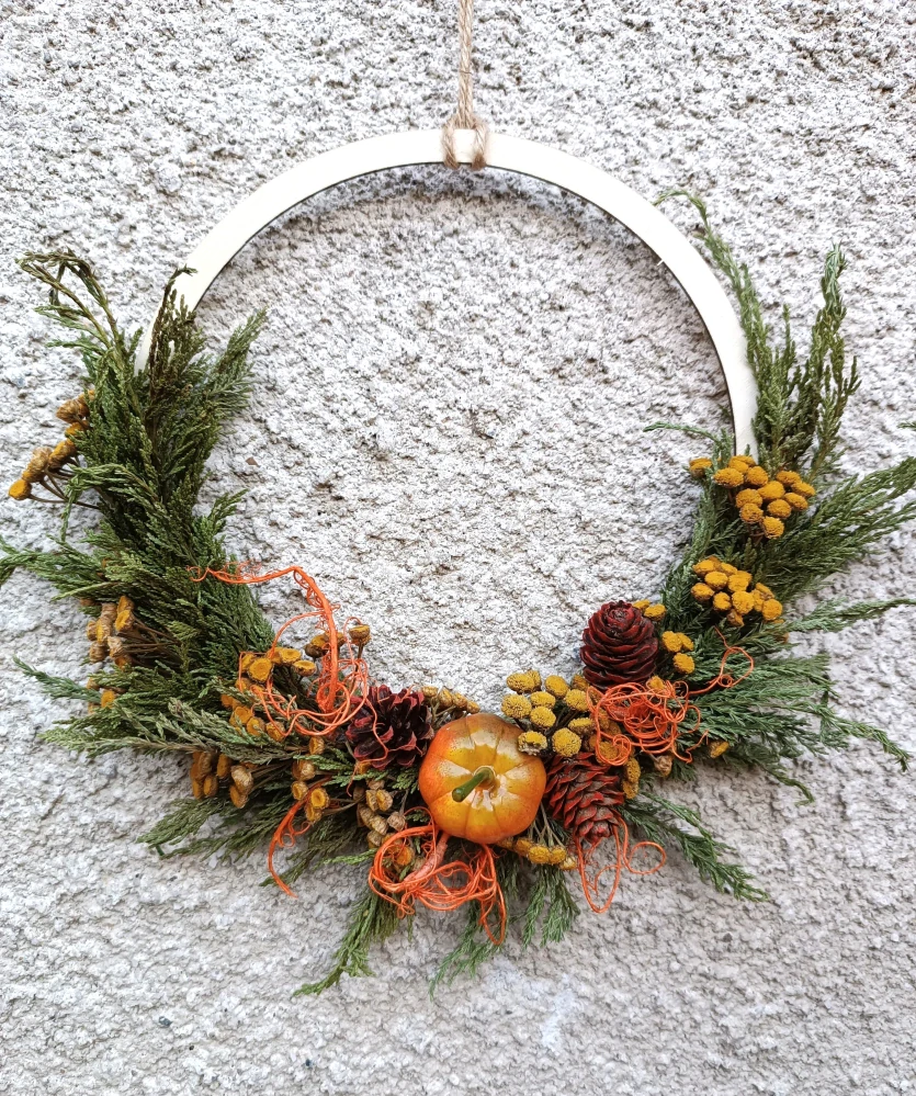 - dřevěný kruh omotaný jalovcem, vratičem, ručně barvenými šiškami, barvenou plastovou dýní