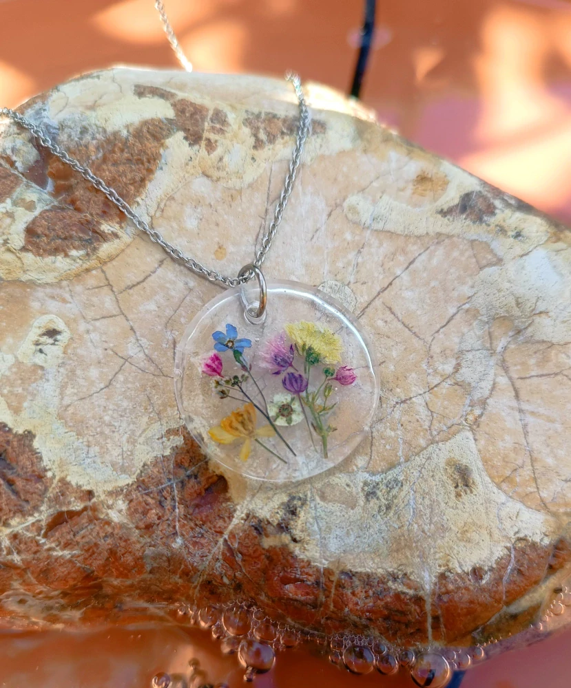 - živé květy zalité v pryskyřici, rozmanité druhy i barvy, jako letní louka plná barev