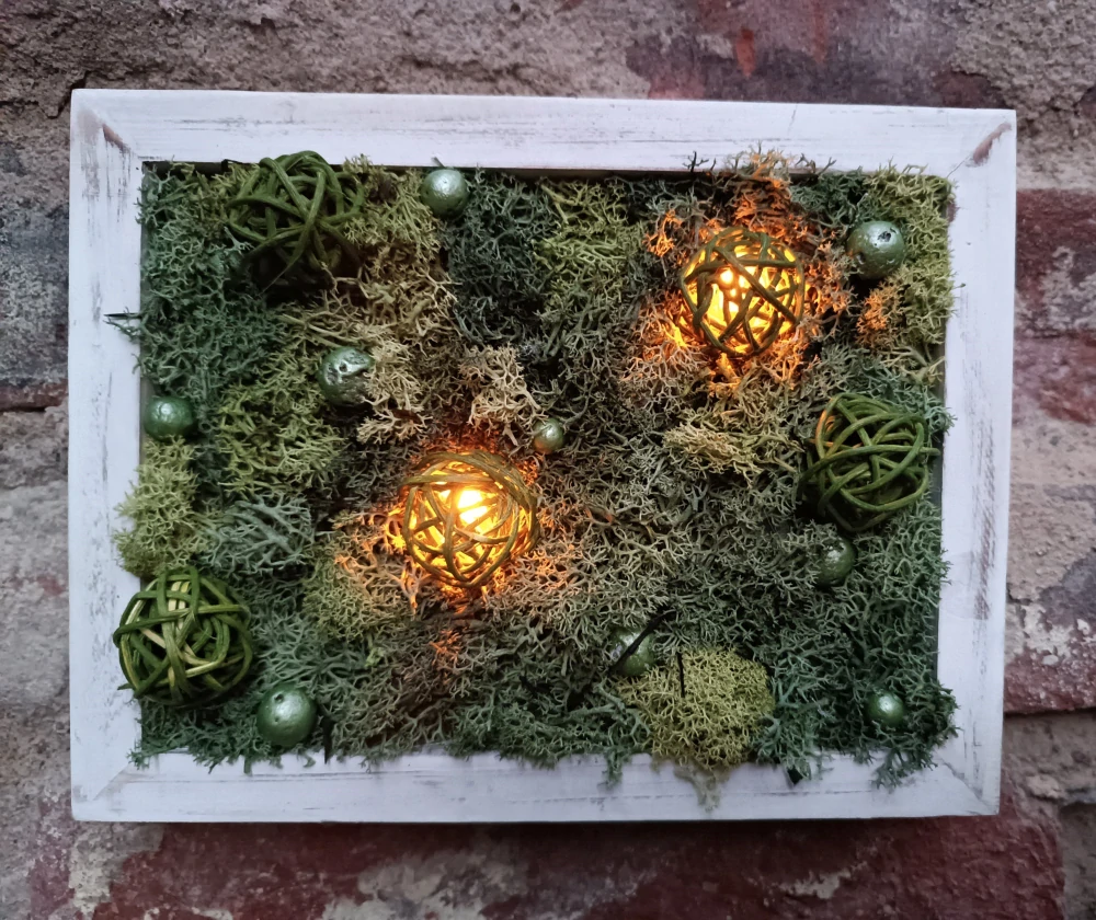 - rámeček dřevěný, patinovaný, doplněno stabilizovaným mechem, ratanovými koulemi, malými zelenými kuličkami