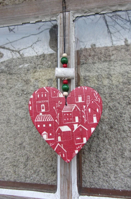 - dřevěné srdce zdobeno z jedné strany červenými domečky (ubrouskouvá technika), z druhé strany bílé, doplněno korálky a dřívkem