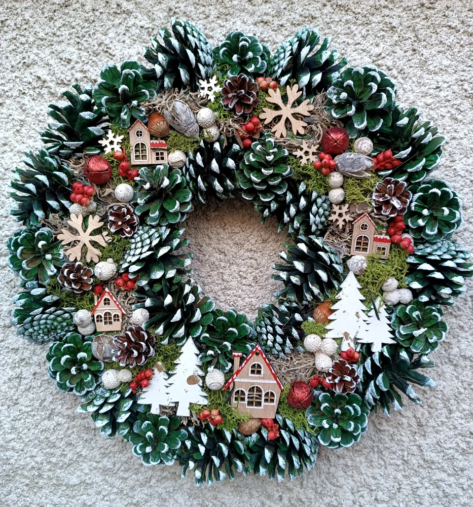 - masivní šiškový věnec - barvené na zeleno, s bílými okraji - symbolizují zasněžené jehličnaté stromečky