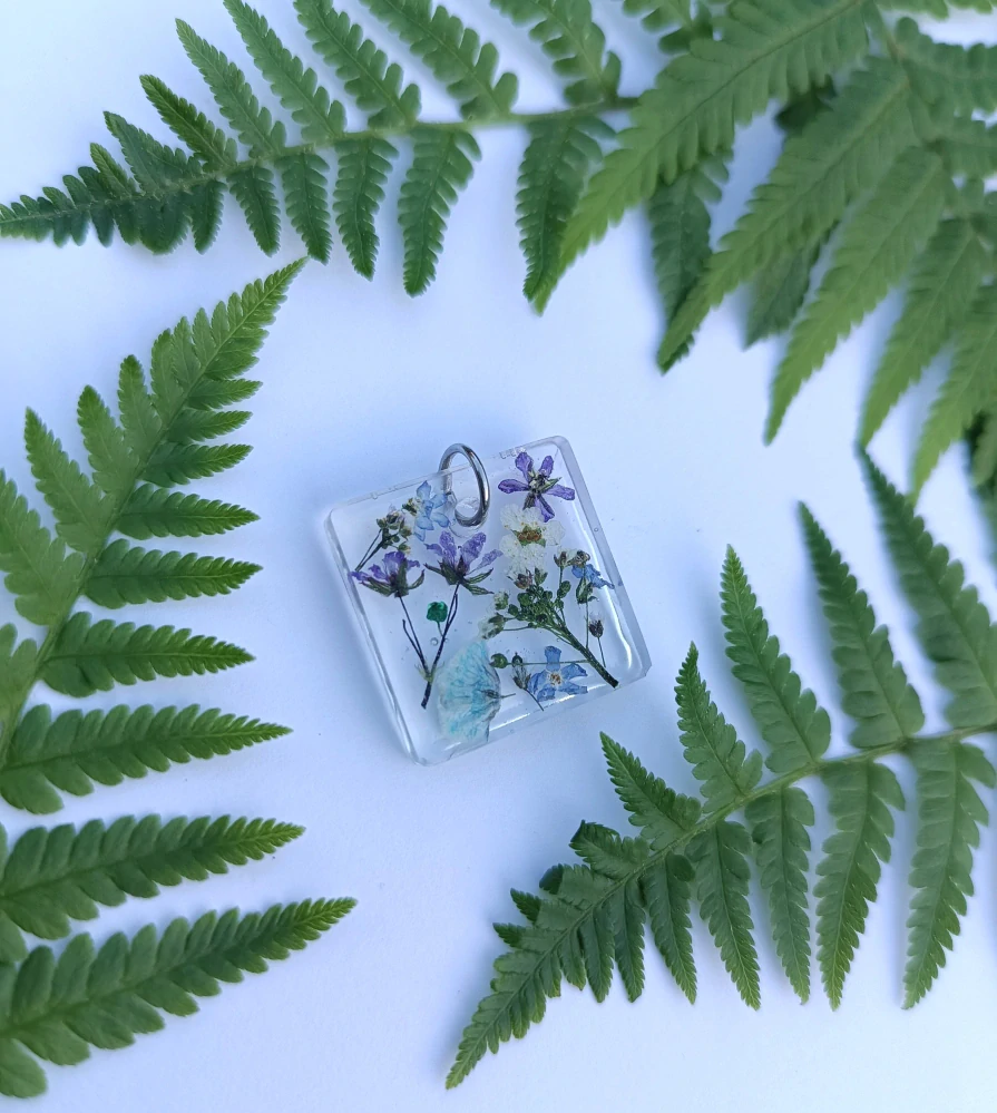 - živé květy zalité v pryskyřici, rozmanité druhy i barvy, v jemných tónech bílé a modré (včetně dvou pomněnek)