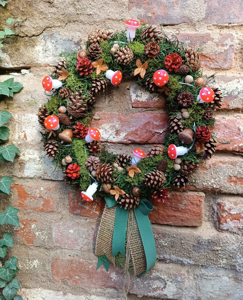 - použitý materiál: slaměný korpus, šišky (přírodní a některé barveny na červeno), žaludy, bukvice, stabilizovaný mech, tillandsia, tmavě zelená sušina, led světýlka
