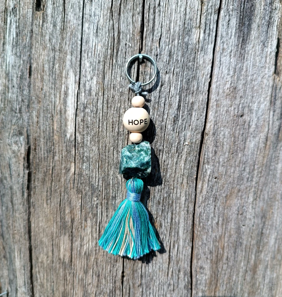- surový achát, dřevěná korálka s nápisem HOPE (víra, naděje), doplněno ručně dělaným střapcem z bavlnek