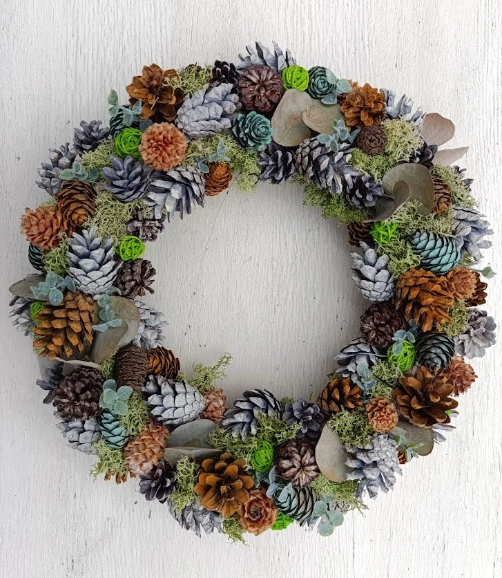- bohatý šiškový věnec doplněn stabilizovaným mechem, suchými listy eukalyptu, ratanovými kuličkami, na slaměném korpusu