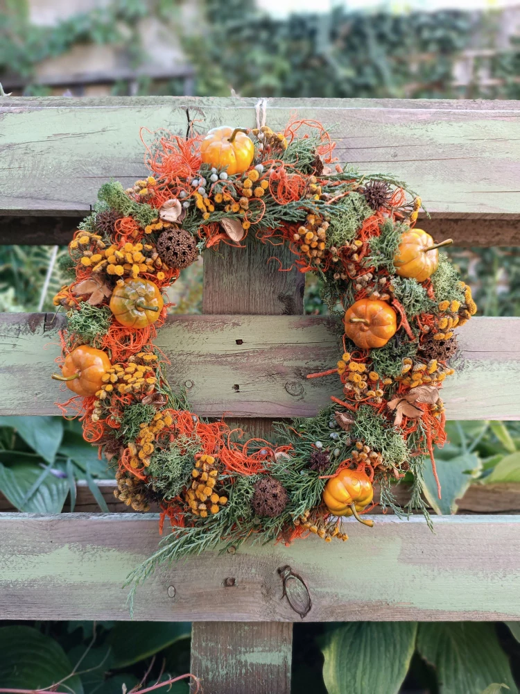 - bohatě zdobený přírodní věnec ve veselých barvách, pouze dýně jsou plastovou imitací