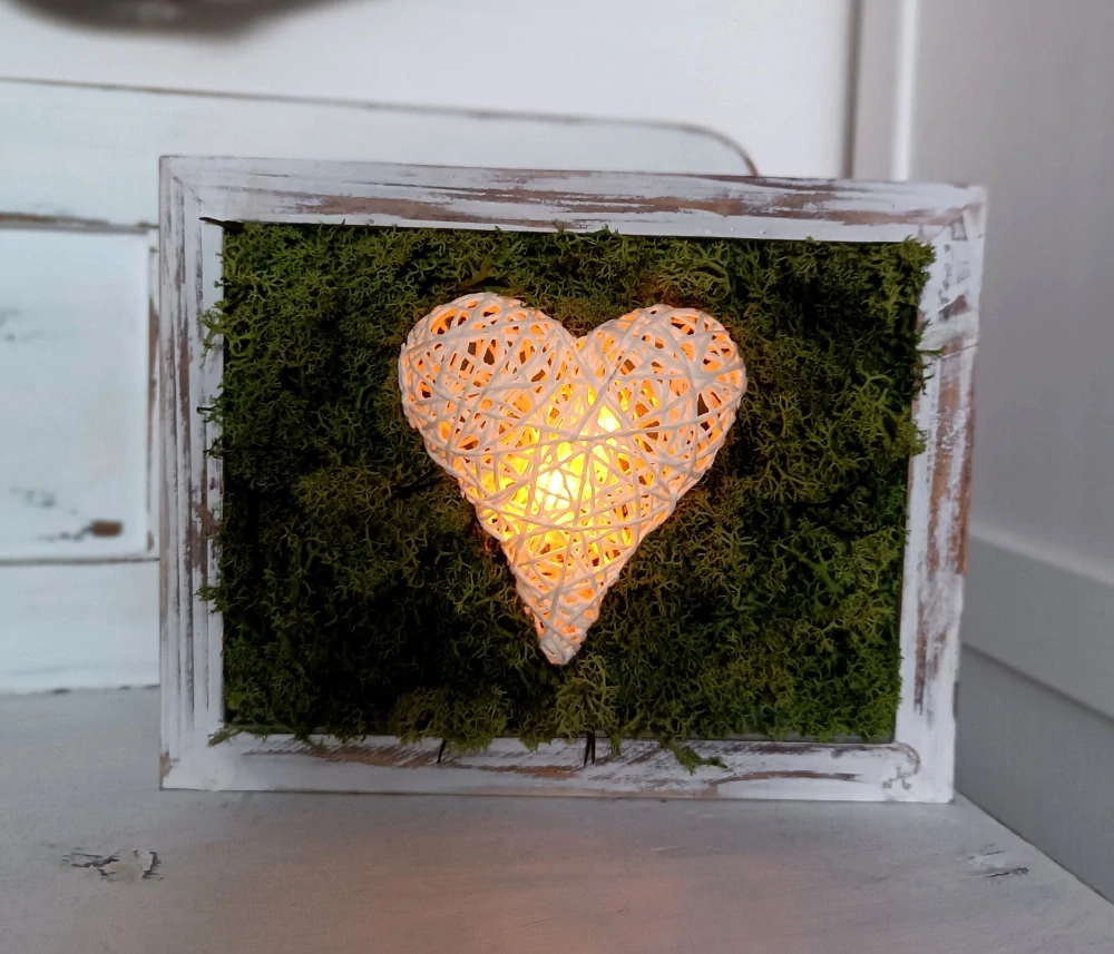 - rámeček dřevěný, patinovaný, doplněno stabilizovaným mechem, srdíčkem uprostřed