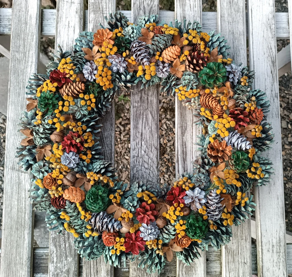 - masivní šiškový věnec - několik druhů šišek, barveny nezávadnou akrylovou barvou bez zápachu