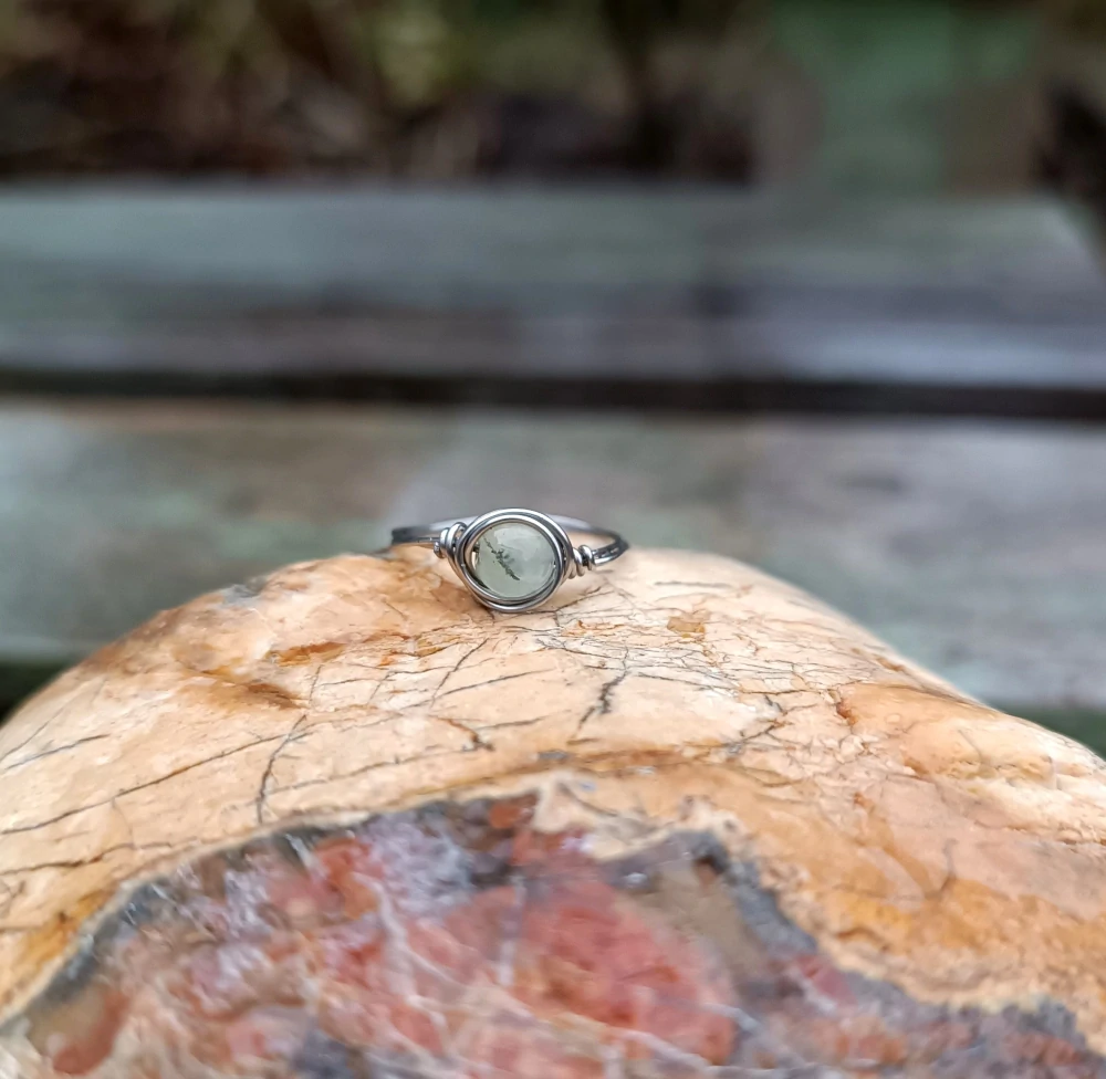 - prsten umotaný z nerezového drátku, uprostřed zelenkavý, lehce průhledný prehnit s jemným černým žíháním (korálek 5 mm velký)