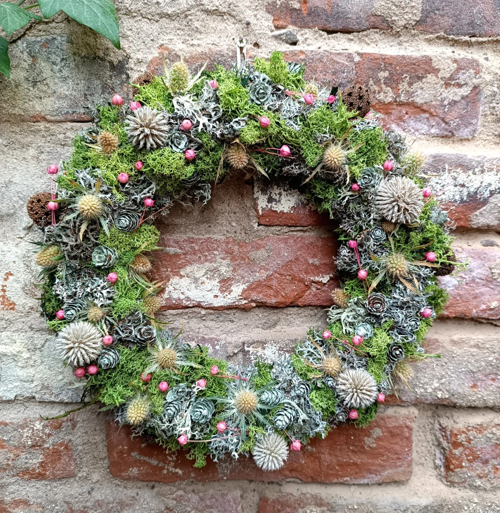 - použitý materiál: slaměný korpus, lišejník, stabilizovaný mech, růžový len, bodlák máčka, bodlák bělotrn, suché plody