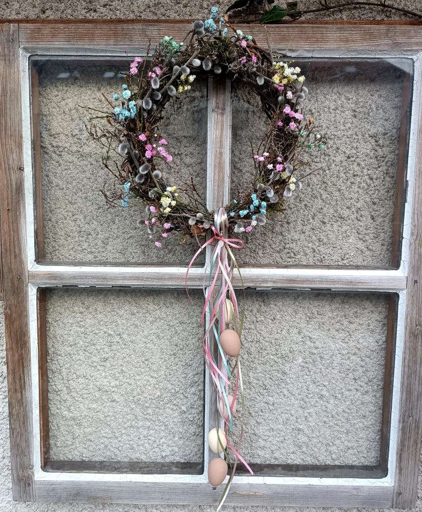 - proutěný věnec z břízy, větviček, statice a kočiček jívy, barevným šaterem