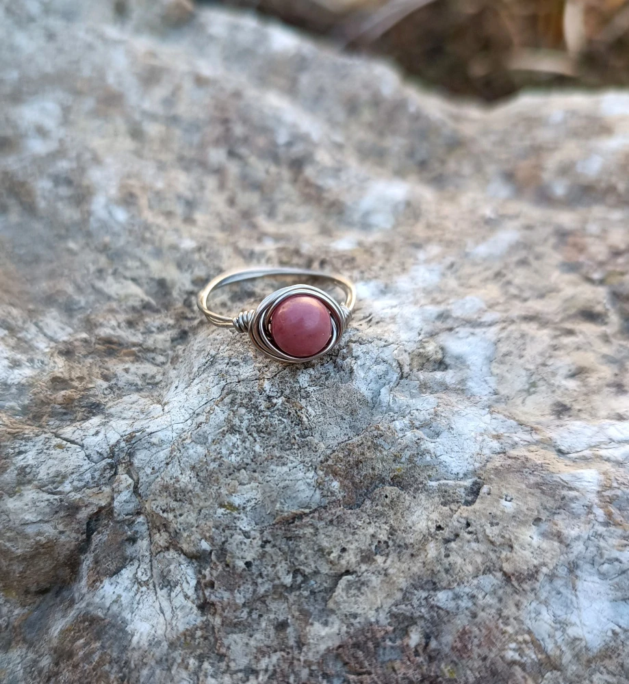 - prsten umotaný z nerezového drátku, uprostřed růžový rodonit (korálek 4 mm nebo větší 6 mm velký) - velikost na výběr