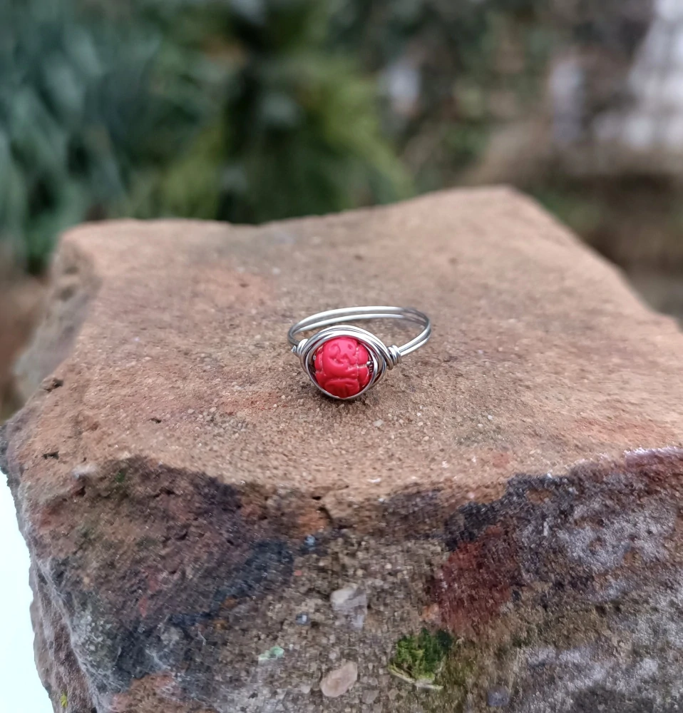 - prsten umotaný z nerezového drátku, uprostřed s broušenou rumělkou (cinabaritem, velikost 6 mm)