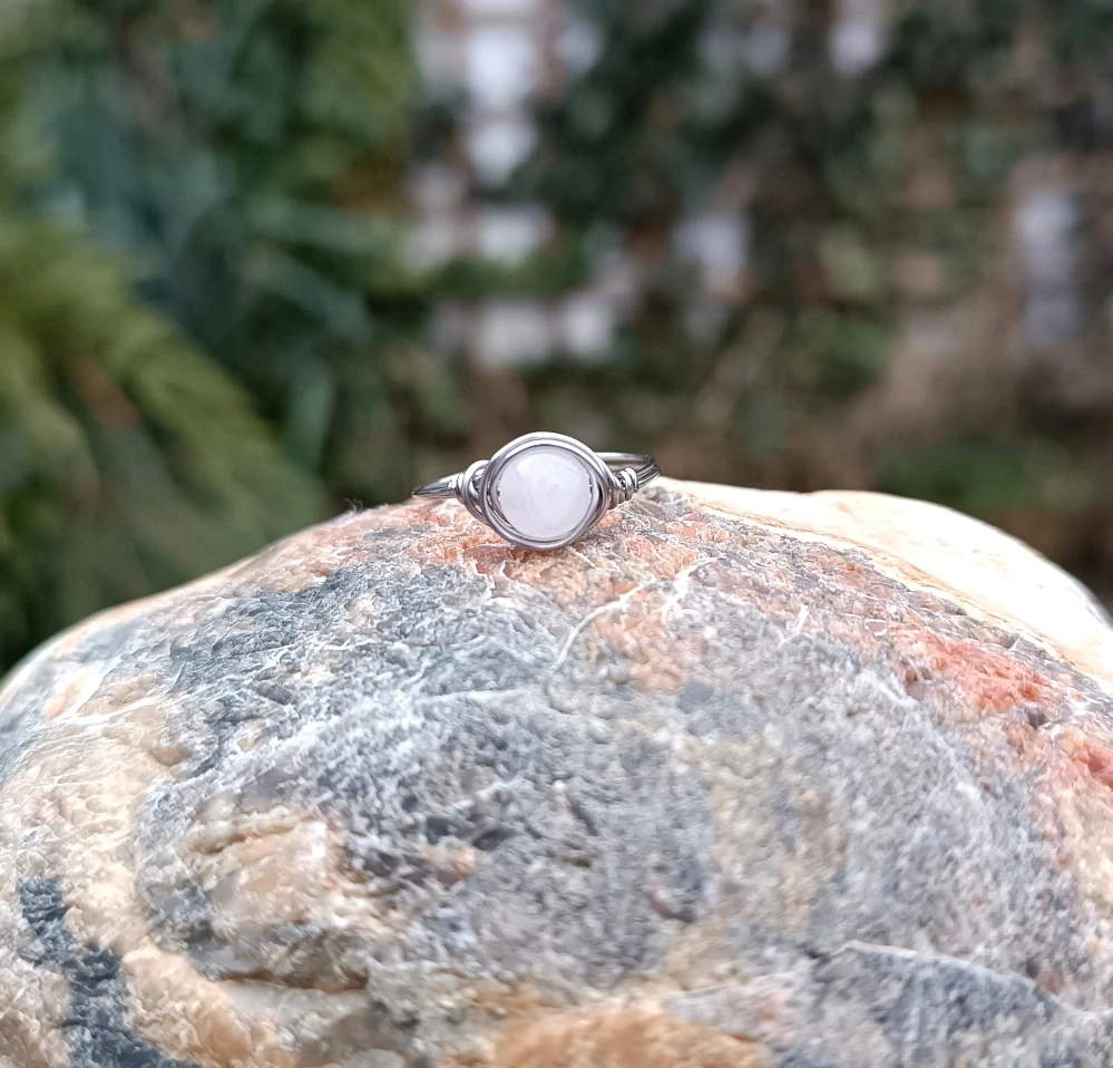 - prsten umotaný z nerezového drátku, uprostřed světle růžový, lehce průsvitný růženín (korálek 4 mm velký)