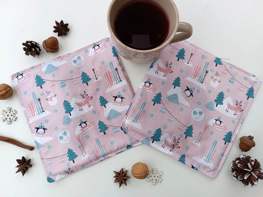 - ručně šitá podložka z krásné bavlněné látky s dětskými motivy Vánoc na růžovém podkladu, oboustranná