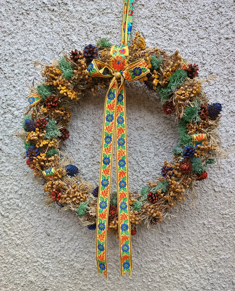 - velký věnec motaný z psího vína, bohatě zdobený - jalovec, ta je už suchá a vyšisovaná, islandský mech, barvené šišky a sušený vratič