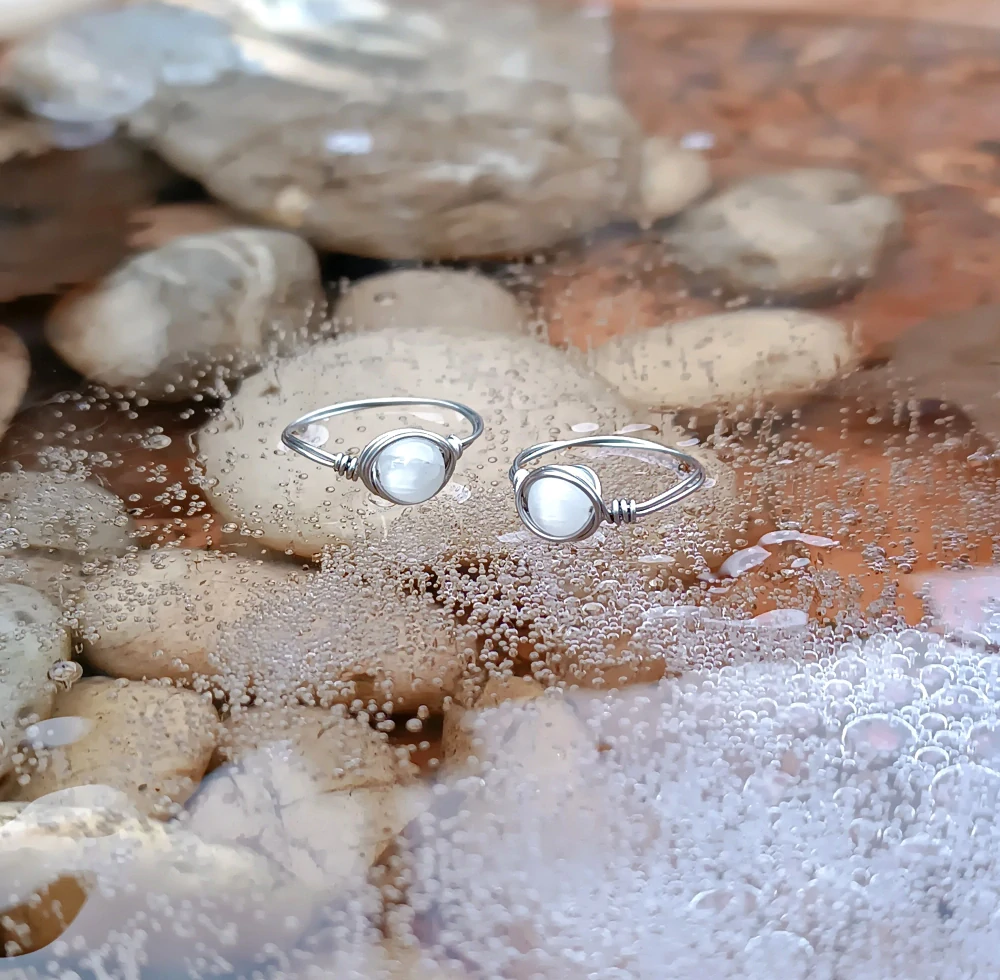 - prsten umotaný z nerezového drátku, uprostřed mléčně bílý selenit s perleťovým leskem (korálek 6 mm velký)