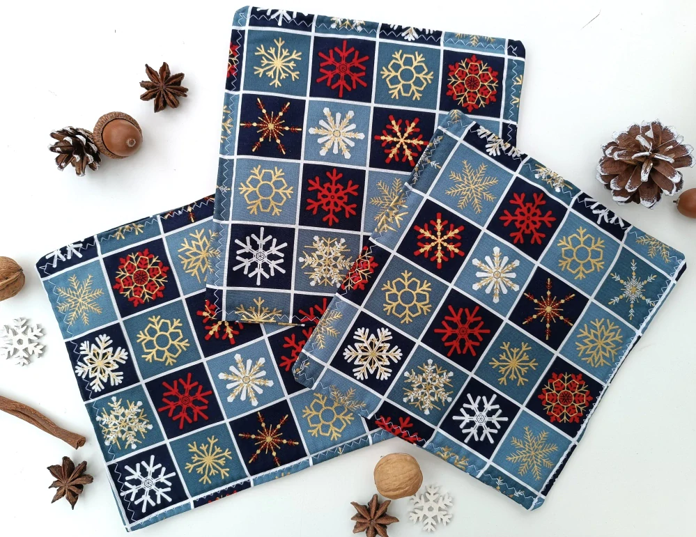 - ručně šitá podložka z krásné bavlněné látky s motivem sněhových vloček, se zlatými efekty, oboustranná