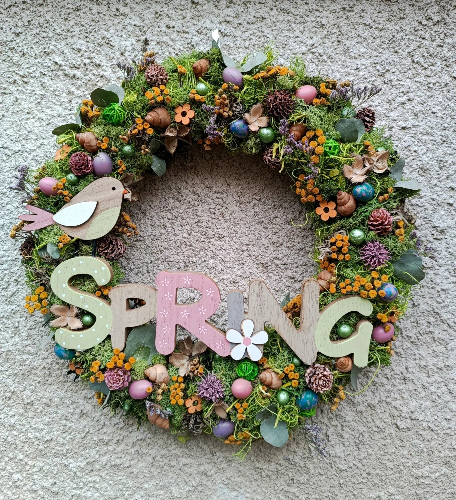 - velký masivní barevný jarní věnec nejen na vchodové dveře, ale kamkoli k zavěšení