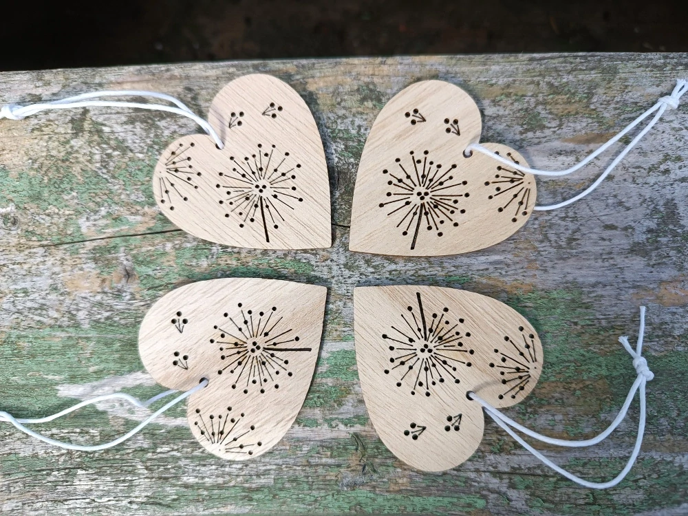 - dřevěné srdíčko s vypáleným motivem pampeliškového chmýří