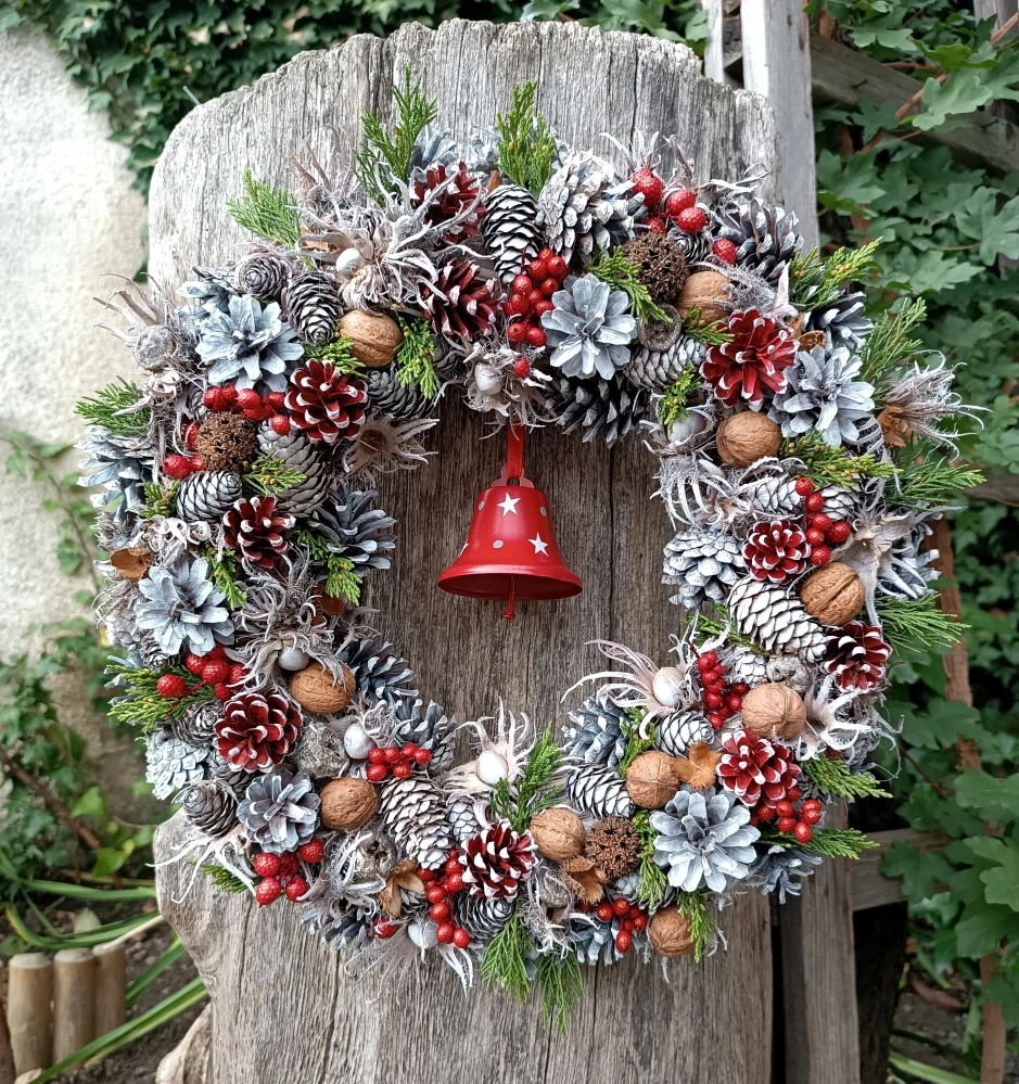 - velký masivní věnec motaný z turecké lísky šišek, s bukvicemi, oříšky, canella bobulkami červené barvy a dalšími suchými plody, s větvičkami thujky