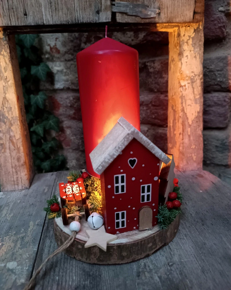 - dřevěný domeček, sáňky, stromeček na kulatině, doplněno trvanlivým přírodním materiálem, s kovovým bodcem