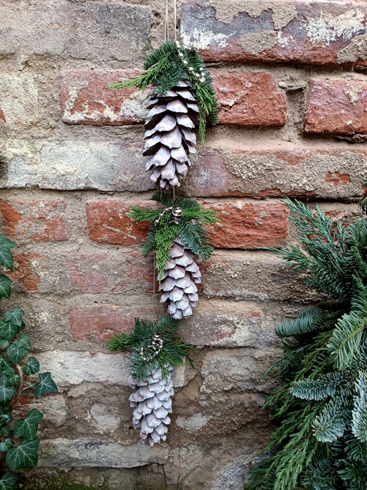 - obří šišky (délka 17 cm), barveny na bílo a doplněné jehličím (chvojí a jalovec) a kovovými rolničkami, hvězdičkami a kuličkovými řetízkem