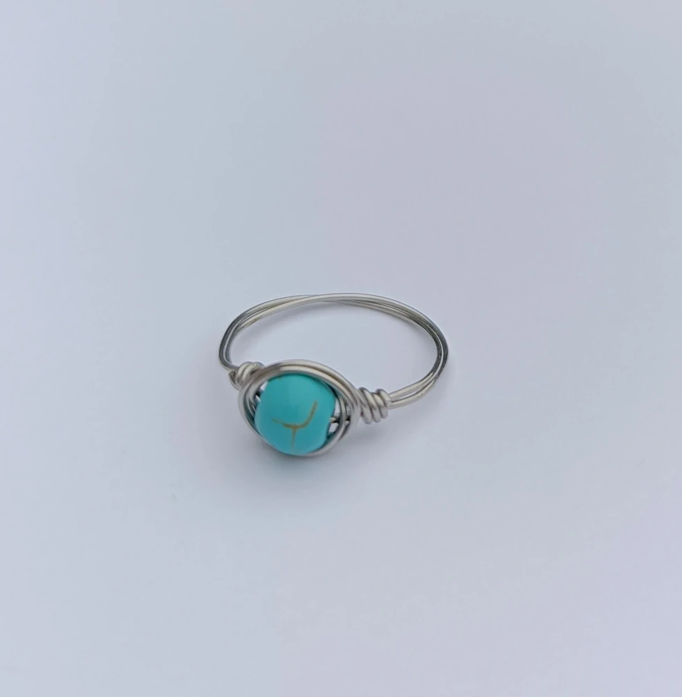 - prsten umotaný z nerezového drátku, uprostřed tyrkenit v krásné typické barvě, některé korálky mají jemné žíhání (velikost 6 mm)