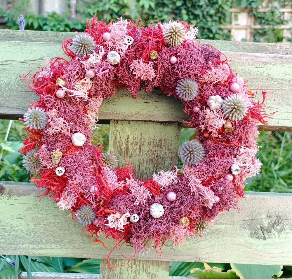 - bohatě zdobený přírodní věneček ze stabilizovaného mechu ve třech odstínech růžové, doplněno červenou sušinou, bělotrnem a exotickými plody