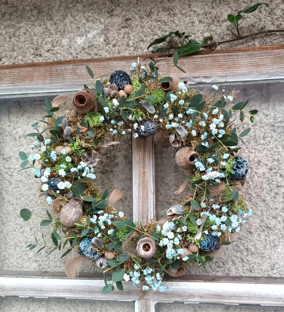 - přírodní a trvanlivý věnec z několika druhů mechu, s peříčky, suchými plody, modrým šaterem
