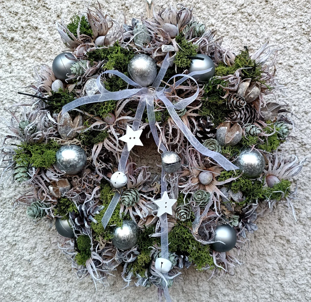 - se zeleným stabilizovaným mechem a dvěma druhy stříbrných baněk, s drobnými zelenkavými šištičkami