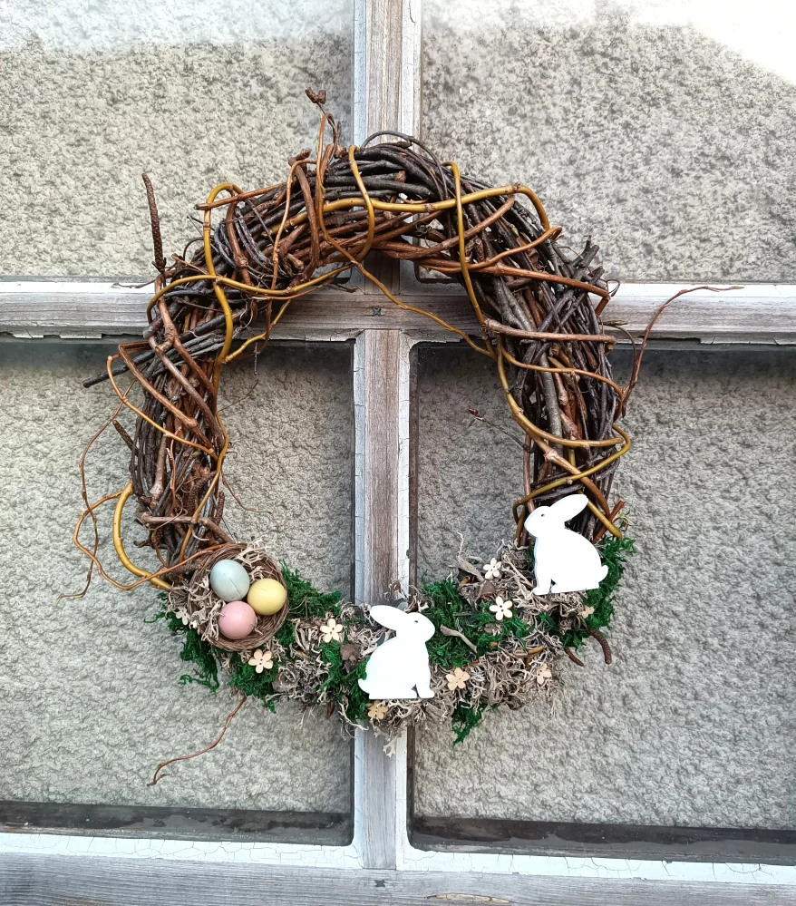 - doplněno suchým mechem, proutěným hnízdem, se třemi ručně barvenými vajíčky, s dřevěnými zajíčky a kvítím