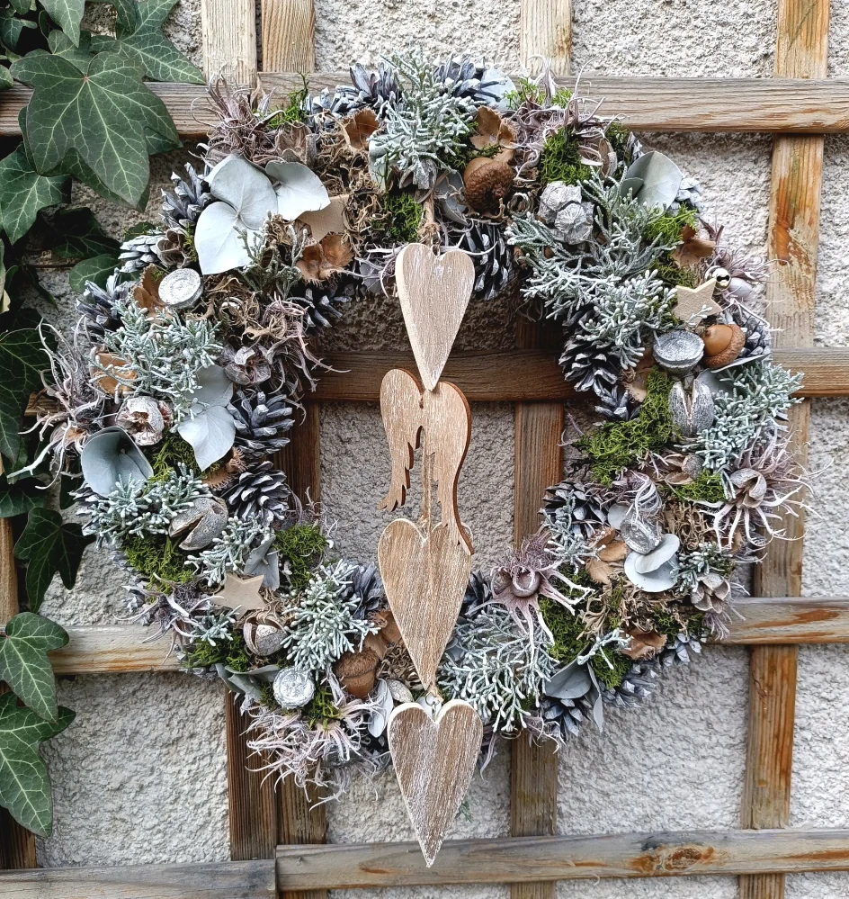 - doplněno dřevěnými dekoracemi, které visí z věnce - srdce a křídla