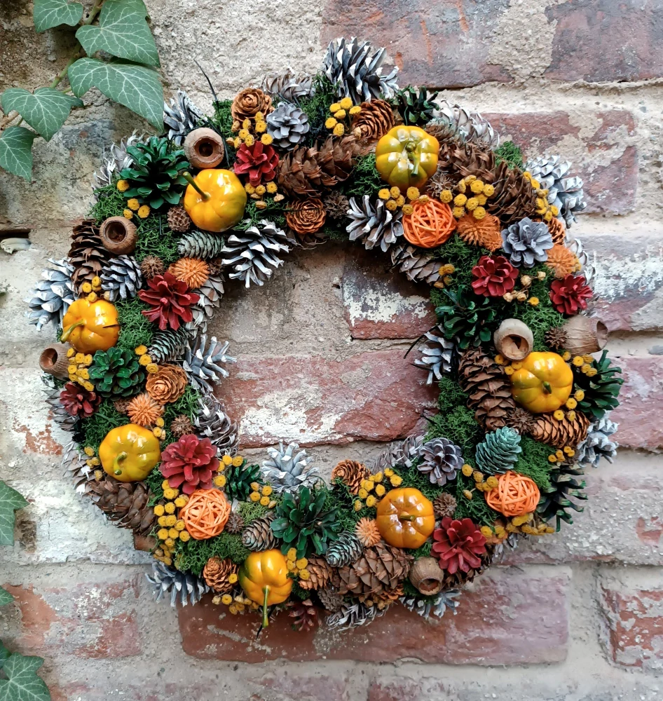 - velký a masivní, bohatě zdobený přírodní věnec ve veselých barvách, pouze dýně jsou plastovou imitací