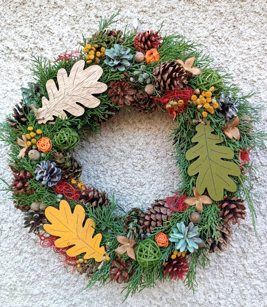 - bohatě zdobený věnec s dřevěnými listy