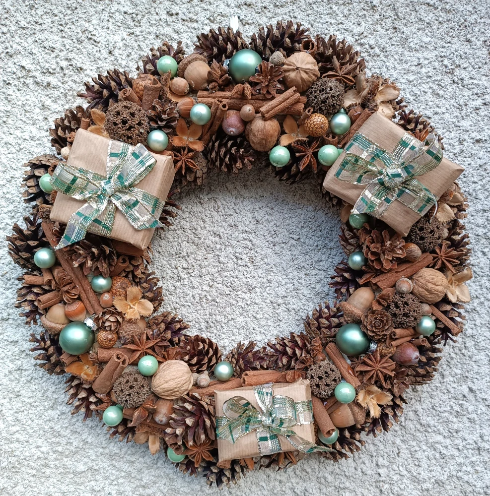 - velký přírodní věnec s ručně vyrobenými dárečky