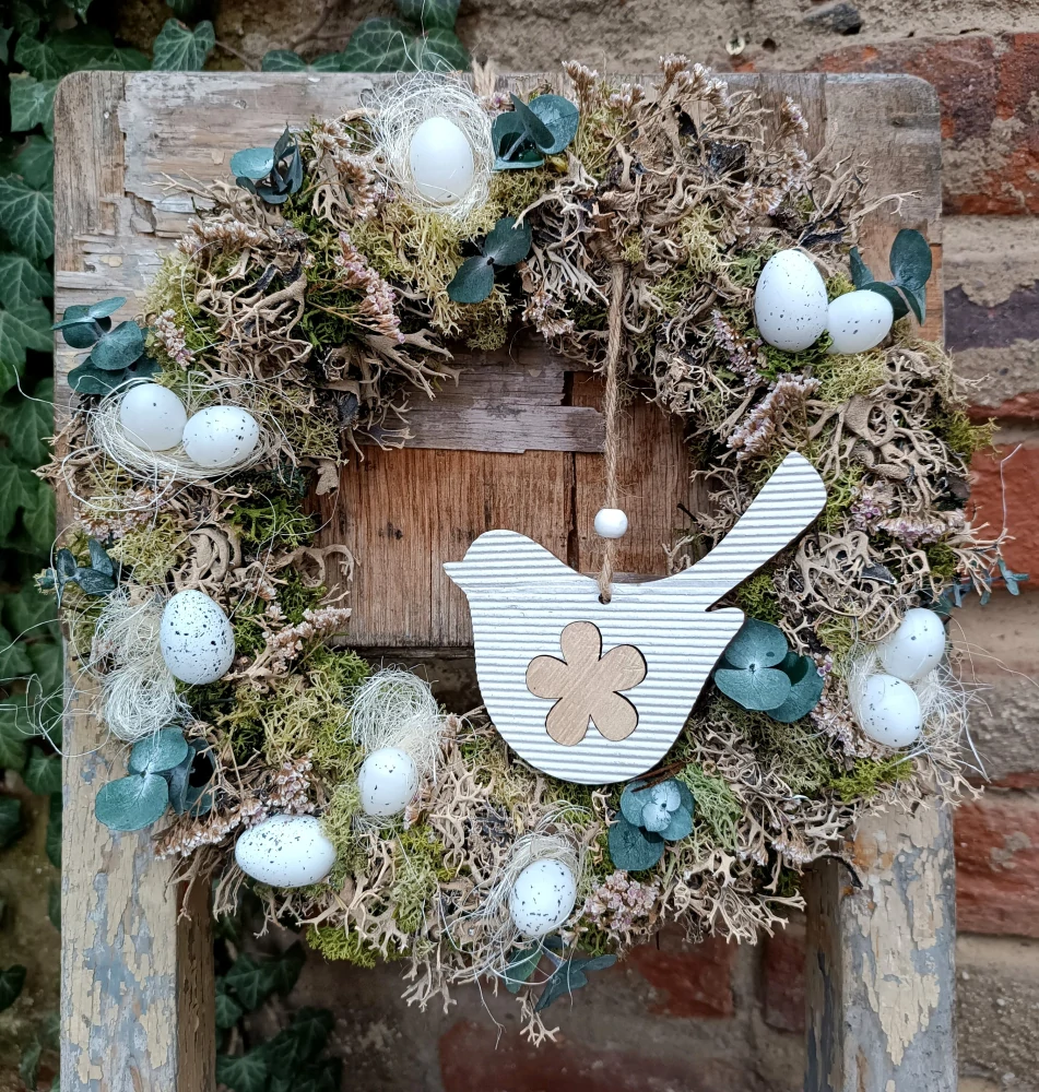 - dva druhy mechu - šedý suchý a zelený stabilizovaný, motáno na slaměném korpusu, doplněno světle fialkovou staticí, dřevěným ptáčkem, stabilizovaným eukalyptem a plastovými vajíčky