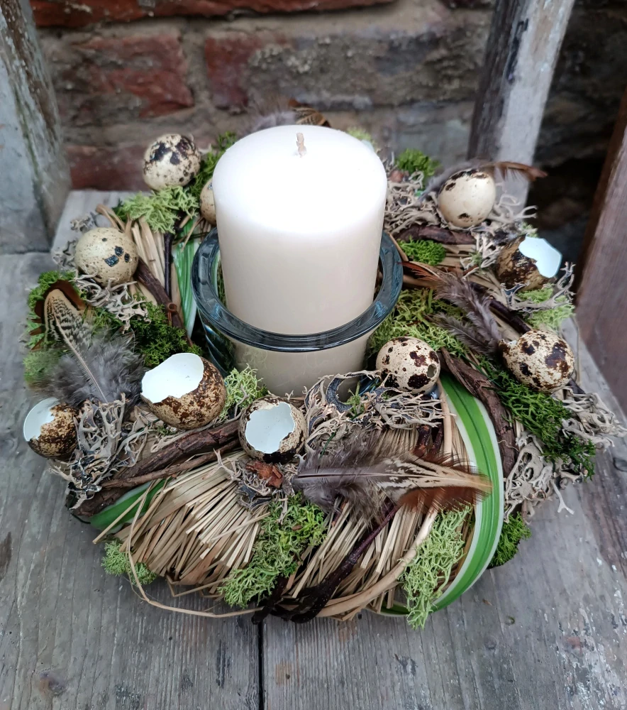 - masivní věnec kombinovaný, z několika druhů materiálu, doplněno stabilizovaným mechem, skořápky pravých vajíček a peřím