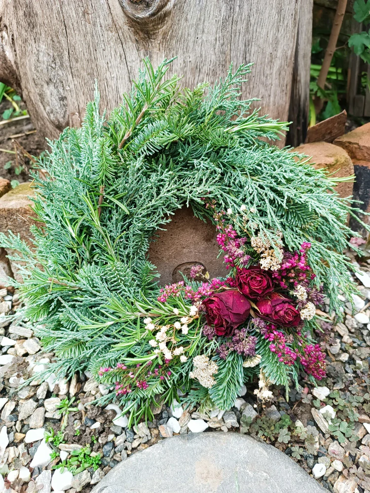 - základ věnečku je zelený jalovec nebo thuje v kombinaci s jedličkou, doplněno rozmarýnem