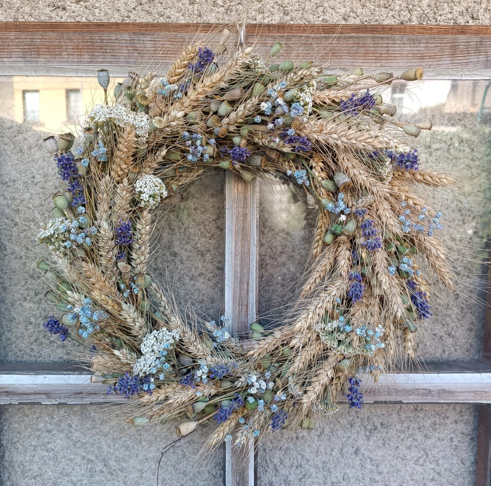 - věnec motaný na březovém korpusu, z obilných klasů, makoviček, řebříčku, levandule a světle modrého šateru