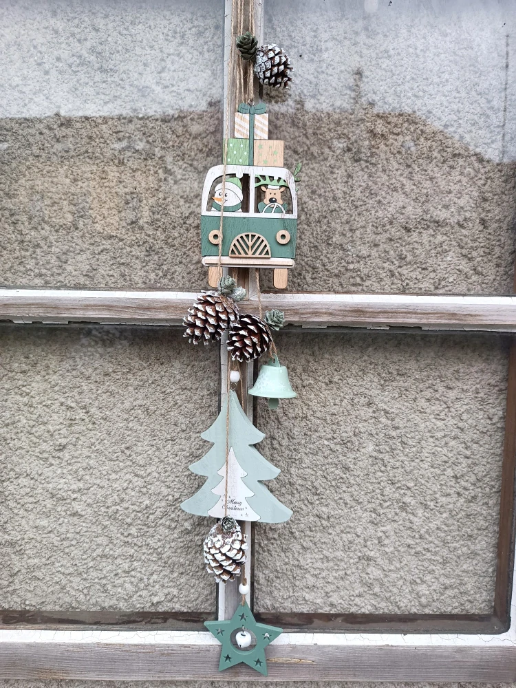 - závěs s dřevěnými ozdobami - autíčko s dárečky, stromeček, hvězda, kovový zvonek